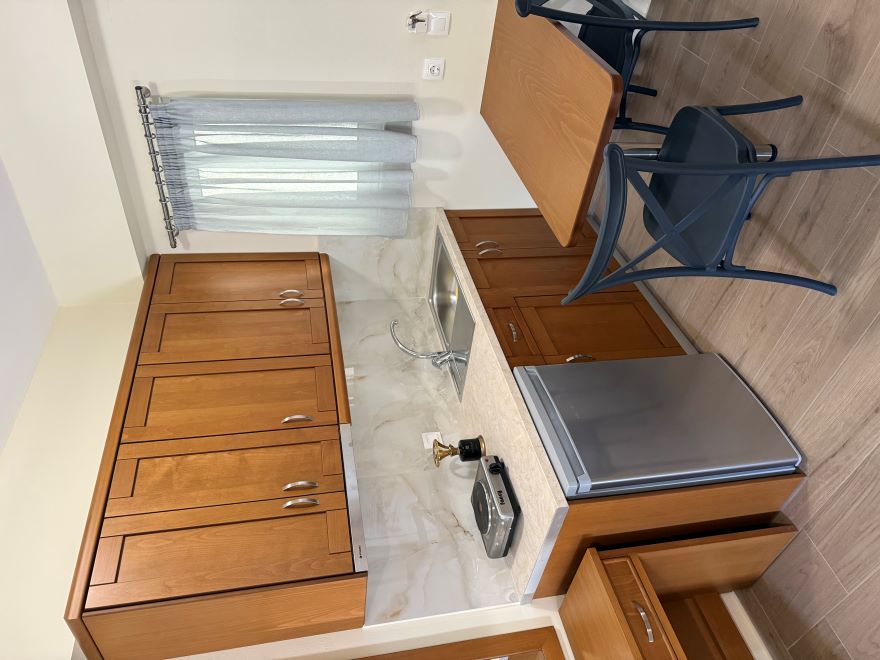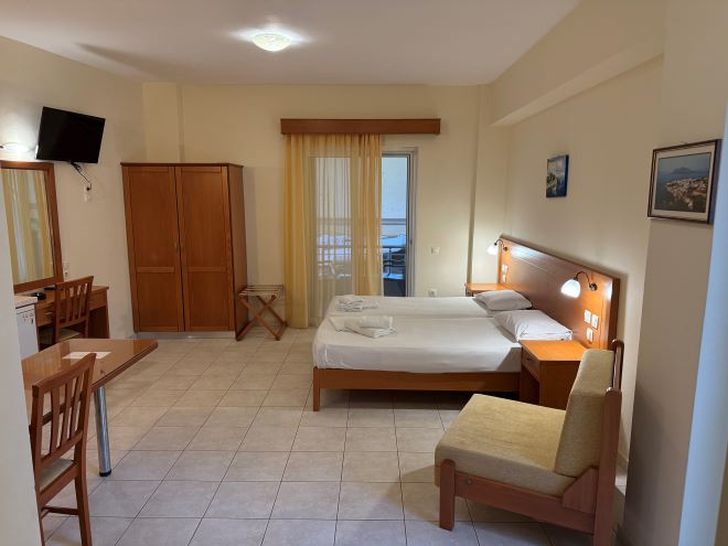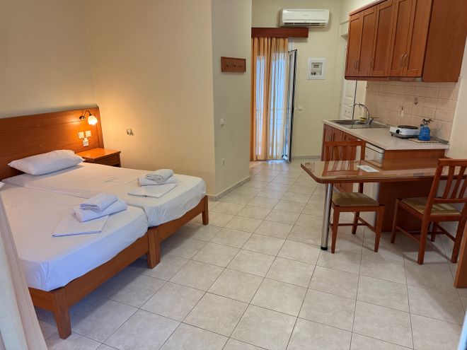 Facilitati camere: Aer conditionat (contra-cost: 5 euro/camera/zi), TV, chicineta complet utilata, plase de tantari, Wifi, balcon